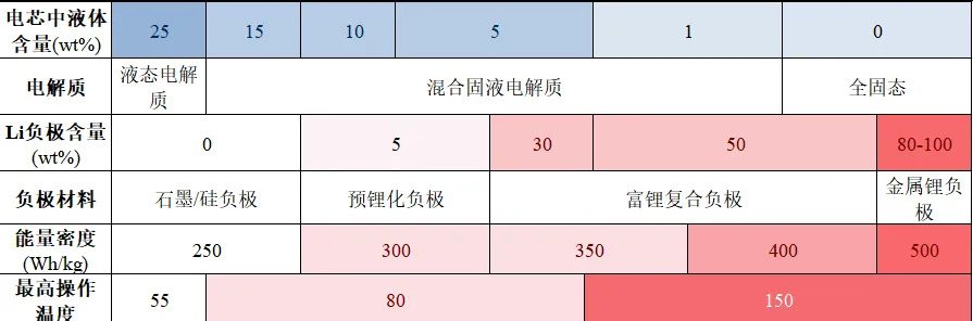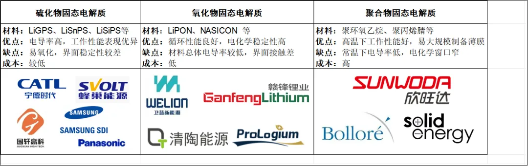 “固態電池”一般分為半固態和全固態,對應的液體含量分別是5-10wt%、0wt%。固態電池研究主要以硫化物電解質技術和氧化物電解質技術路線為主,輔以聚合物電解質技術路線,其中寧德時代、蜂巢能源、國軒高科為硫化物電解質技術路線的代表企業,衛藍新能源、清陶能源、輝能科技為氧化物電解質技術路線的代表企業,欣旺達為聚合物電解質技術路線的代表企業。