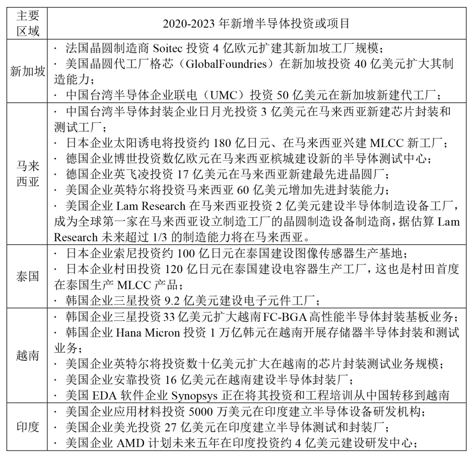 全球半導(dǎo)體產(chǎn)業(yè)集中在美國(guó)、中國(guó)大陸、歐洲、日本、韓國(guó)和中國(guó)臺(tái)灣六大區(qū)域,據(jù)相關(guān)數(shù)據(jù)顯示,2022年六大區(qū)域半導(dǎo)體產(chǎn)值占比超過(guò)98%。而新加坡、馬來(lái)西亞等地,雖然也有半導(dǎo)體產(chǎn)業(yè)的布局,但普遍處于產(chǎn)業(yè)鏈中低端,例如全球15%-20%的被動(dòng)元件產(chǎn)能布局在東南亞。近年來(lái)由于中美半導(dǎo)體貿(mào)易脫鉤加劇,國(guó)際地緣沖突等因素作用,進(jìn)一步催化全球半導(dǎo)體產(chǎn)業(yè)鏈分流和遷移,新加坡、馬來(lái)西亞、泰國(guó)、越南和印度等半導(dǎo)體“二線”區(qū)域正從半導(dǎo)體行業(yè)的全球布局調(diào)整中受益匪淺。主要特征:①美國(guó)、歐洲等國(guó)家和地區(qū)企業(yè)均以提高供應(yīng)鏈在面對(duì)國(guó)際地緣政治緊張局勢(shì)時(shí)的彈性為由,持續(xù)加大在新加坡等地的投資(見(jiàn)表3)。②根據(jù)Gartner的預(yù)測(cè),2021-2027年亞太地區(qū)(除日韓、中國(guó)的大陸和臺(tái)灣地區(qū)外)的半導(dǎo)體產(chǎn)業(yè)收入的年均復(fù)合增速將超過(guò)中國(guó)臺(tái)灣、美國(guó)、歐洲、中國(guó)大陸、日韓等傳統(tǒng)半導(dǎo)體“一線”區(qū)域,成為未來(lái)5年全球增長(zhǎng)最快的區(qū)域(見(jiàn)表4)。
