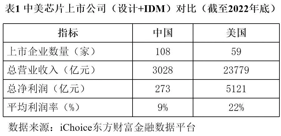二是低端化競(jìng)爭(zhēng)嚴(yán)重。如表1所示,根據(jù)2023年上半年已經(jīng)上市的108家設(shè)計(jì)企業(yè)的半年報(bào)數(shù)據(jù),108家企業(yè)中虧損的企業(yè)數(shù)量高達(dá)42家,2022年設(shè)計(jì)領(lǐng)域全部上市企業(yè)的總營(yíng)收和總凈利潤(rùn)分別是美國(guó)上市芯片企業(yè)(設(shè)計(jì)+IDM企業(yè))的12.7%和5.3%,平均利潤(rùn)率相差近3倍。低利潤(rùn)率的原因在于大量設(shè)計(jì)企業(yè)在產(chǎn)品端缺乏差異化創(chuàng)新,只能進(jìn)行價(jià)格戰(zhàn),同時(shí)企業(yè)數(shù)量短時(shí)間內(nèi)大量擴(kuò)張引發(fā)人才和供應(yīng)鏈資源的激烈“爭(zhēng)奪”,造成成本的快速上漲。