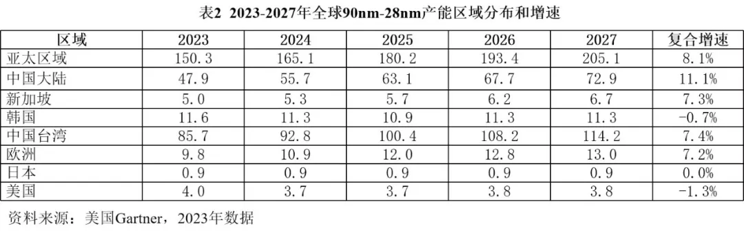 二是我國(guó)集成電路產(chǎn)能擴(kuò)充集中在90納米-28納米工藝節(jié)點(diǎn)。根據(jù)Gartner數(shù)據(jù),2023-2027年我國(guó)90納米-28納米成熟工藝代工產(chǎn)能在全部成熟工藝代工產(chǎn)能中擴(kuò)產(chǎn)規(guī)模最快,達(dá)到11.1%(見表2)。另外根據(jù)美國(guó)“集微咨詢”數(shù)據(jù),目前我國(guó)已經(jīng)建成和在建的規(guī)劃產(chǎn)能基本以90納米-28納米成熟工藝為主。2027年,90納米-28納米成熟工藝產(chǎn)能在我國(guó)總產(chǎn)能中占比將達(dá)到57.9%。