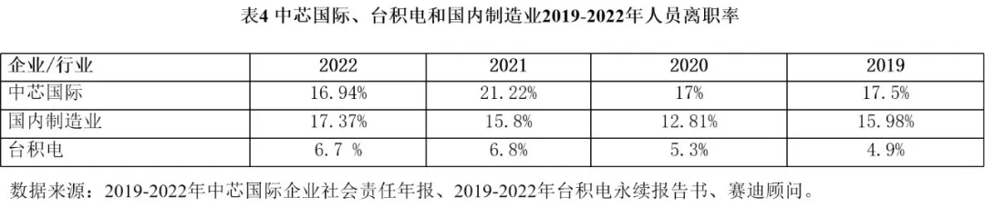 一是人才資源內(nèi)耗嚴(yán)重。產(chǎn)業(yè)“內(nèi)卷化”勢(shì)必會(huì)帶來(lái)嚴(yán)重的人才內(nèi)耗,尤其是對(duì)于制造業(yè)、設(shè)備材料業(yè)這些本就人才總量嚴(yán)重不足,高端人才捉襟見肘的領(lǐng)域傷害更大。近年來(lái)國(guó)內(nèi)的“建廠潮”,導(dǎo)致制造業(yè)人員離職率居高不下,如表5所示,近4年制造業(yè)人員離職率持續(xù)在15%以上,是臺(tái)積電人才流失率的2-3倍。而國(guó)內(nèi)制造業(yè)龍頭中芯國(guó)際在2020年、2021年兩個(gè)“建廠”大年,人員離職率相比國(guó)內(nèi)制造業(yè)平均水平高出5個(gè)百分點(diǎn)。