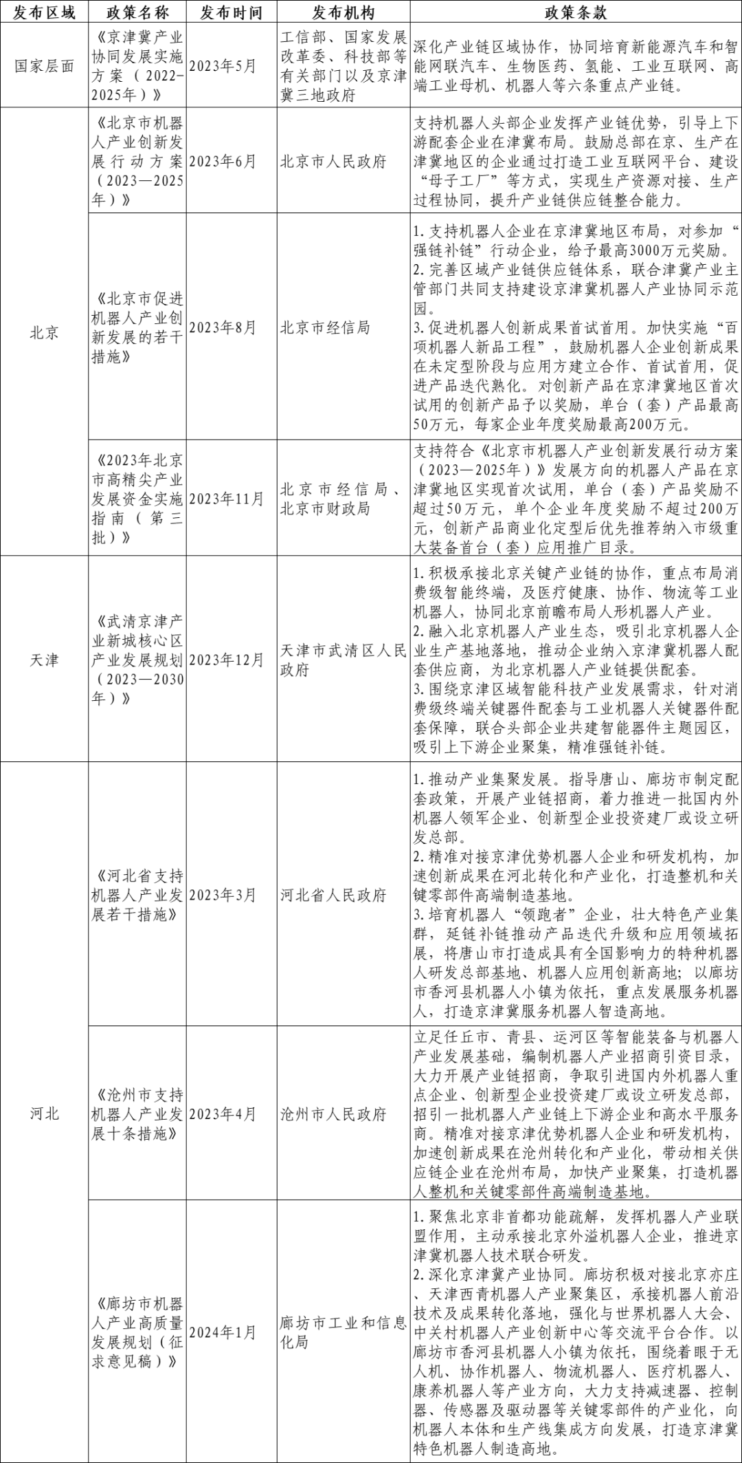 《京津冀產(chǎn)業(yè)協(xié)同發(fā)展實施方案(2022-2025年)》中對京津冀三地在機器人產(chǎn)業(yè)發(fā)展領(lǐng)域和空間布局有明確的部署。北京作為產(chǎn)品研發(fā)和技術(shù)突破基地,發(fā)展機器人控制系統(tǒng)和綜合服務(wù)平臺;天津在經(jīng)開區(qū)、濱海高新區(qū)、武清區(qū)等地布局專業(yè)服務(wù)機器人和特種機器人的產(chǎn)品研發(fā)和產(chǎn)業(yè)化;河北省在唐山、廊坊布局特種機器人產(chǎn)業(yè),在滄州、邯鄲等地發(fā)展零部件和關(guān)鍵材料制造。京津冀三地也相繼出臺多項政策推動機器人產(chǎn)業(yè)鏈和供應(yīng)鏈的落地布局。