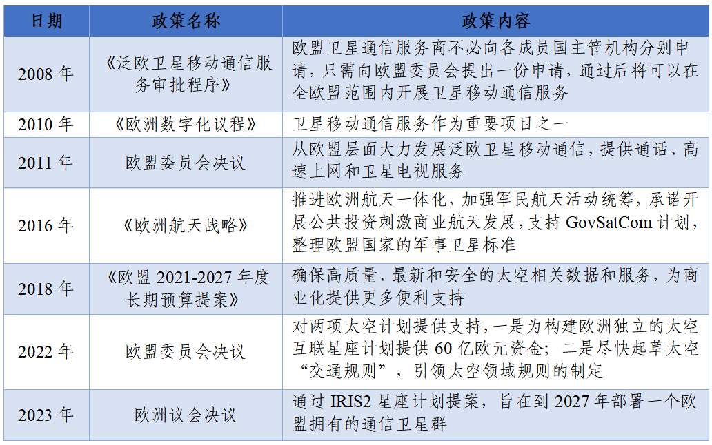 歐盟衛星通信領域政策更加關注市場開放和公平競爭、國際合作、通信安全以及自主可控等方面。在促進市場開放和公平競爭方面,歐盟采取簡化審批程序、減少市場準入壁壘和鼓勵私營部門參與等措施,推動衛星通信市場開放。如歐盟于2008年啟動泛歐衛星移動通信服務審批程序,旨在簡化流程,促進歐盟衛星通信行業發展。在加強國際合作方面,歐盟積極參與國際電信聯盟等組織活動,旨在參與制定全球衛星通信標準,確保衛星軌道資源的合理分配和協調利用。同時,歐盟積極搶占全球太空治理話語權,2022年,歐盟委員會宣布起草太空交通管理規則,旨在解決太空碎片等問題。在保障衛星通信安全方面,歐盟于2018年提出歐洲太空計劃,該計劃的核心目標是確保數據與服務高質量和安全。在提升自主能力方面,歐盟于2016年發布《歐洲航天戰略》,提出強化航天能力,確保航天自主性,增強歐盟在航天領域的國際地位和全球市場競爭力,深化泛歐航天合作。2023年,歐洲議會通過安全連接計劃(IRIS2)提案,旨在部署歐盟通信衛星群,通過減少對第三方的依賴確保歐盟的自主權。