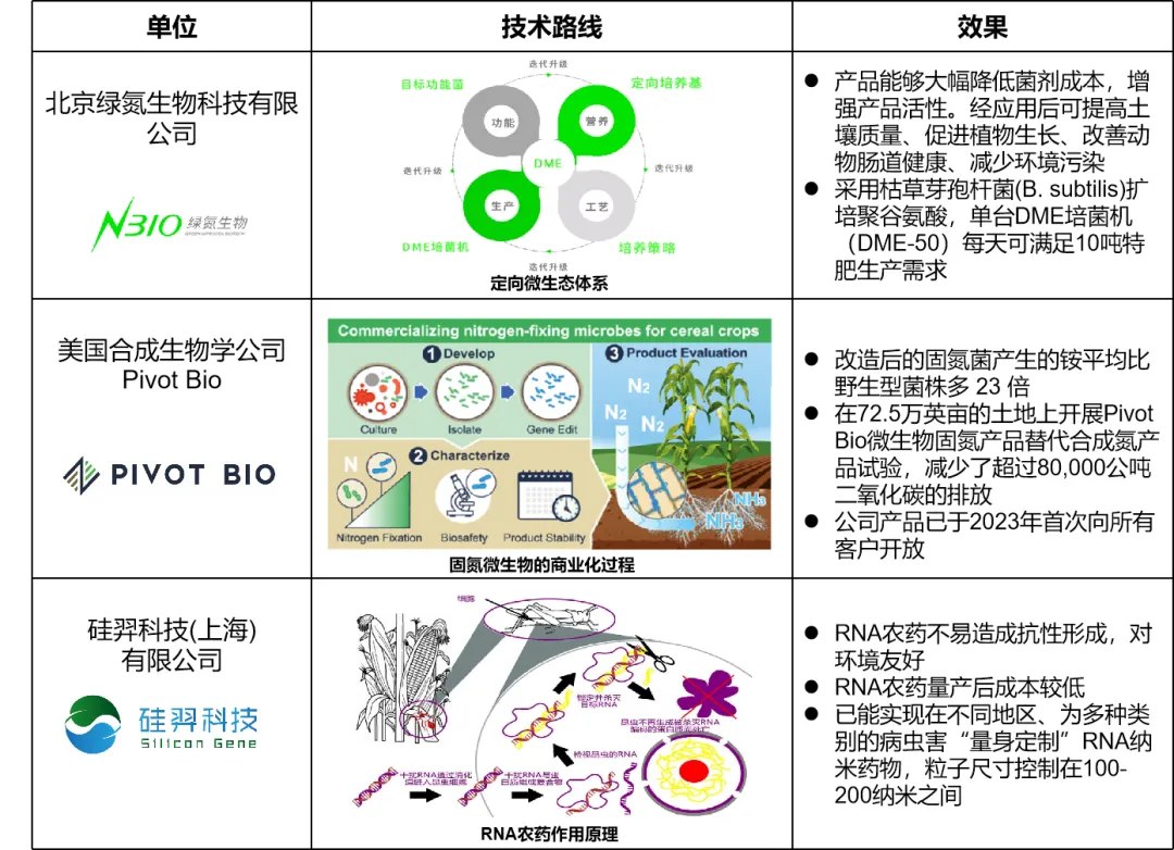 合成生物學(xué)技術(shù)與農(nóng)業(yè)領(lǐng)域的結(jié)合日益緊密,并在部分方向上已有商業(yè)化成果。目前,農(nóng)業(yè)合成生物學(xué)的基礎(chǔ)研究主要集中在人工細(xì)胞合成、細(xì)胞工廠、種質(zhì)改良、二氧化碳固定、生物固氮和農(nóng)業(yè)環(huán)境優(yōu)化等方面,應(yīng)用研究主要集中在植物天然產(chǎn)物開發(fā)、農(nóng)作物性狀改良、病蟲害防控、肥料生產(chǎn)、飼料及添加劑制備等方面,目前能夠或接近實現(xiàn)商業(yè)化的應(yīng)用主要集中在作物育種、固氮肥料、農(nóng)藥生物制造等領(lǐng)域。相比之下,生物固碳、生物固氮和代謝途徑改造等仍處于初期概念階段。