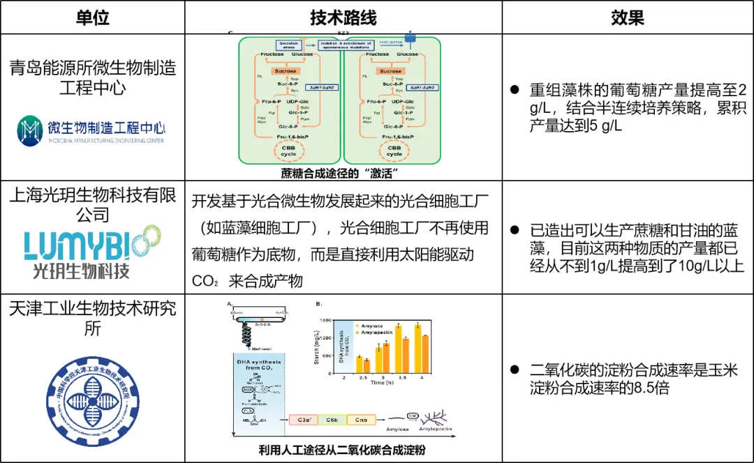 目前國內(nèi)已有團(tuán)隊在該領(lǐng)域取得研究進(jìn)展,如青島能源所微生物制造工程中心實現(xiàn)藍(lán)細(xì)菌直接利用二氧化碳合成葡萄糖;上海光玥生物科技有限公司改造出可以生產(chǎn)蔗糖和甘油的藍(lán)藻;天津工業(yè)生物技術(shù)研究所成功實現(xiàn)從二氧化碳到淀粉的人工合成,但基本都還處于實驗室概念驗證階段。