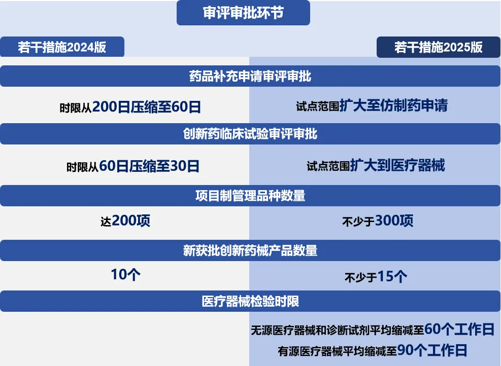 臨床試驗審評審批方面,持續(xù)深化國家藥監(jiān)局相關(guān)試點工作,將優(yōu)化創(chuàng)新藥臨床試驗審評審批試點擴大到醫(yī)療器械,將藥品補充申請審評審批試點爭取擴大至仿制藥申請。藥械檢驗檢測能力方面,首次明確提出提效量化目標,推動實現(xiàn)無源醫(yī)療器械和診斷試劑平均縮減至60個工作日、有源醫(yī)療器械平均縮減至90個工作日,持續(xù)保持醫(yī)療器械檢驗?zāi)芰θ珖I(lǐng)先地位。針對臨床急需藥械產(chǎn)品,在全國率先實現(xiàn)即收即檢。項目制管理方面,持續(xù)擴大服務(wù)范圍和對象,較2024年新增納入項目制服務(wù)藥械品種數(shù)量100項,累計達300項。多項舉措助力藥械產(chǎn)品上市“加速度”,實現(xiàn)2025年新獲批創(chuàng)新藥械產(chǎn)品數(shù)量不少于15個。