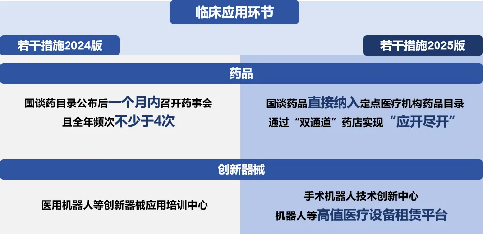 創(chuàng)新藥方面,相較于上海、廣東等地增加召開藥事會頻次,北京率先提出國談藥可直接納入全市定點醫(yī)療機構(gòu)藥品目錄,無需召開藥事會,醫(yī)療機構(gòu)可通過“雙通道”藥店實現(xiàn)“應(yīng)開盡開”。此外,支持醫(yī)療機構(gòu)針對創(chuàng)新價值高但臨床數(shù)據(jù)較少、實際證據(jù)不充分的藥物開展真實世界研究,驗證藥物臨床價值。創(chuàng)新醫(yī)療器械方面,搭建機器人等高值醫(yī)療設(shè)備租賃平臺,運用市場化方式打通創(chuàng)新醫(yī)療器械入院“最后一公里”,破解創(chuàng)新醫(yī)療器械高成本與推廣難的矛盾,加快手術(shù)機器人入院應(yīng)用和創(chuàng)新迭代。