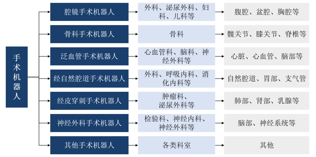 根據臨床場景,主要分為腔鏡、骨科、泛血管、經自然腔道、經皮穿刺、神經外科手術機器人等。