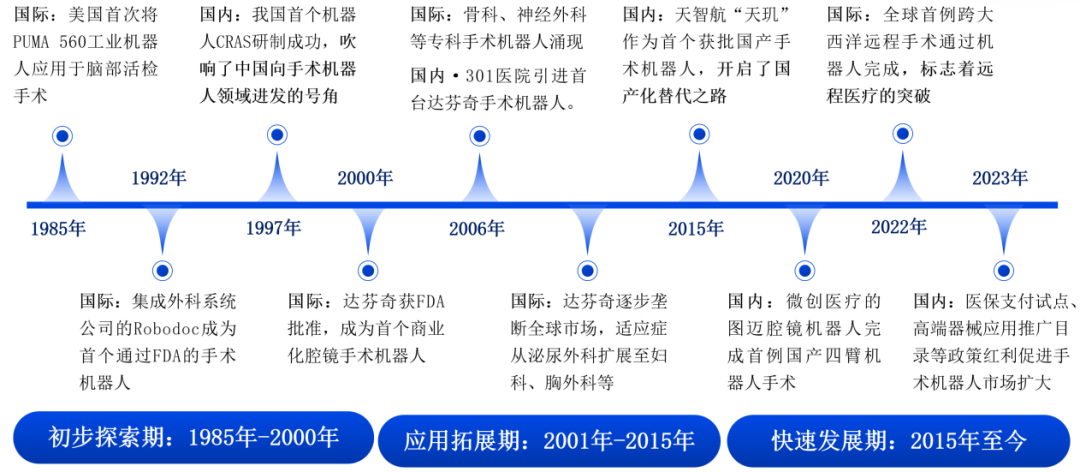 從行業發展生命周期角度看,手術機器人歷經了早期探索、應用拓展、快速發展三個主要時期。