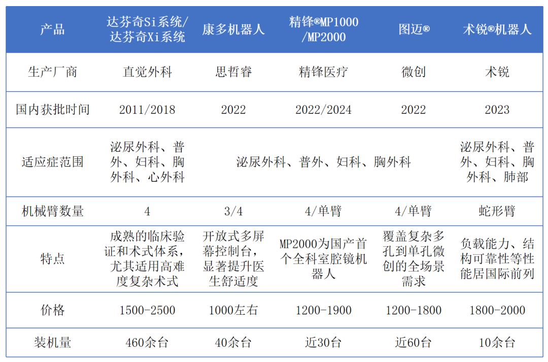 截至目前,國內累計獲批超10款,包括達芬奇Si和達芬奇Xi、思哲睿康多、精鋒MP1000、微創圖邁、術銳®機器人等,裝機量近600臺。達芬奇憑借成熟的臨床驗證和完整的術式體系,占據70%市場,國產產品憑借性價比和本土化優勢等正加速入局,其中,微創的圖邁是國內最早上市的四臂腔鏡機器人,產品性能國內外領先,遠程系統優勢突出,在全球超30個國家或地區獲得注冊認證,成功進入歐洲市場;精鋒醫療MP2000兼具科室廣度、術式難度優勢;康多機器人以更高性價比優勢加快進入縣級醫院市場。