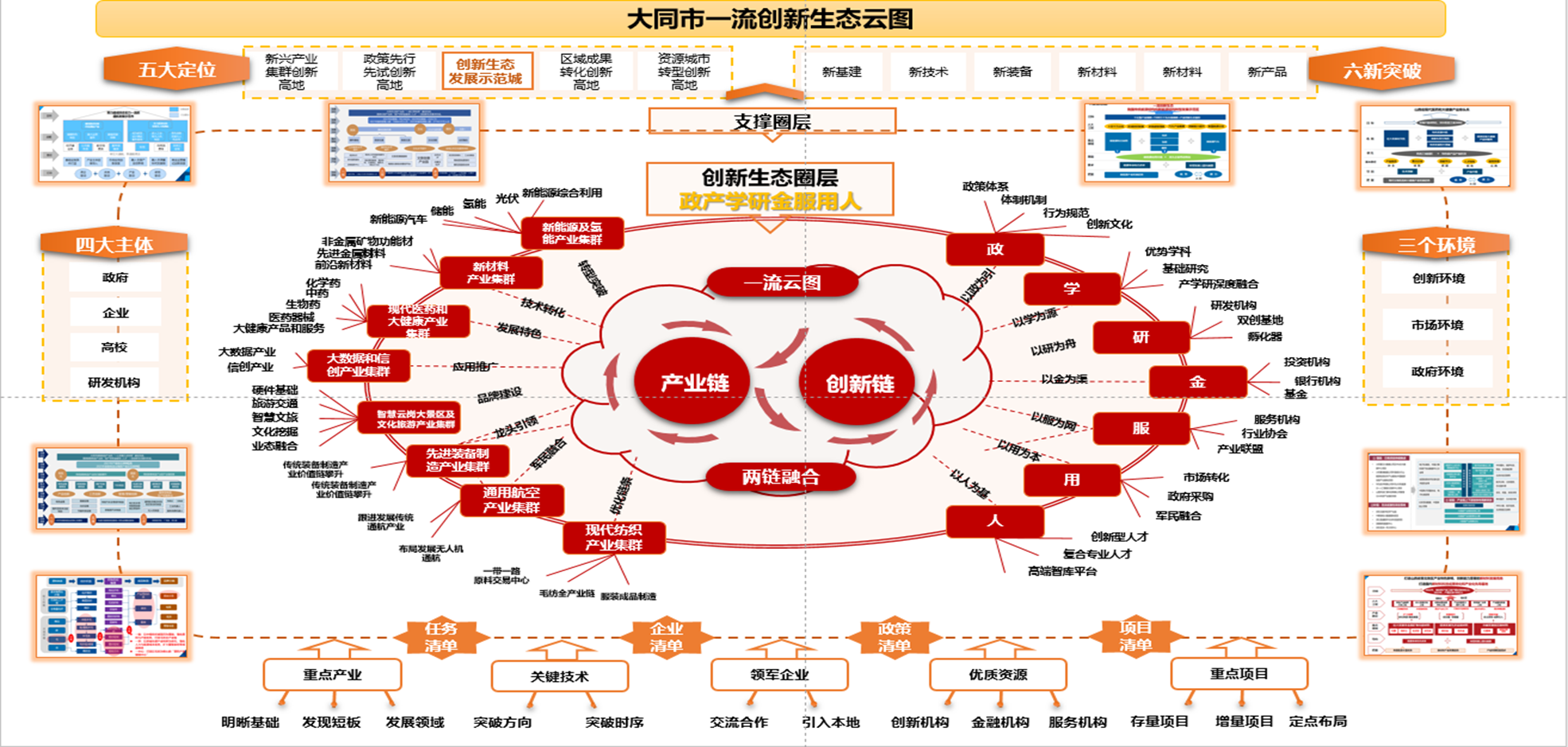 立足大同市貫徹落實國家創(chuàng)新驅(qū)動戰(zhàn)略和山西省“創(chuàng)新生態(tài)建設(shè)”發(fā)展要求,瞄準實現(xiàn)“轉(zhuǎn)型出雛型”的重要階段性戰(zhàn)略目標,提出以產(chǎn)業(yè)集群培育為主線,推進創(chuàng)新鏈和產(chǎn)業(yè)鏈深度融合,從強化高校院所活力、構(gòu)建企業(yè)創(chuàng)新體系、激活創(chuàng)新消費市場、建立創(chuàng)新生態(tài)制度等方面入手,圍繞“政、產(chǎn)、學、研、金、服、用”+“人才”整合創(chuàng)新資源要素,構(gòu)建網(wǎng)絡(luò)化、規(guī)模化、系統(tǒng)化的大同市創(chuàng)新生態(tài)頂層設(shè)計和作戰(zhàn)實施圖,指導大同市在高質(zhì)量轉(zhuǎn)型發(fā)展上率先蹚出新路。