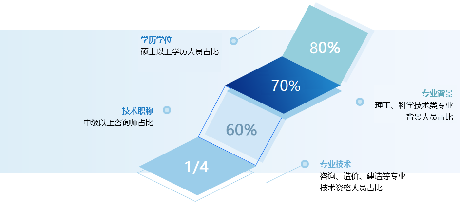 公司為國(guó)家高新技術(shù)企業(yè),具有雄厚的咨詢(xún)技術(shù)服務(wù)力量,現(xiàn)有員工270余人,其中碩士及以上學(xué)歷占80%以上,理工、科學(xué)技術(shù)類(lèi)專(zhuān)業(yè)背景人員占比近70%。
